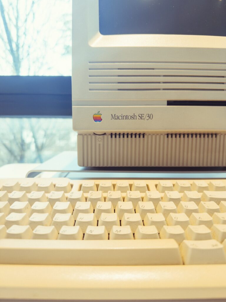 I especially like how this old Apple Macintosh is placed with the ceiling light directly on top.