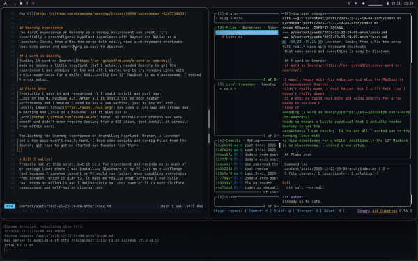 Replicating the Omarchy experience by installing Hyprland, Waybar, a launcher and a few apps weren’t really hard. I took some scripts and config files from the Omarchy git repo to get me started and tweaked from there.